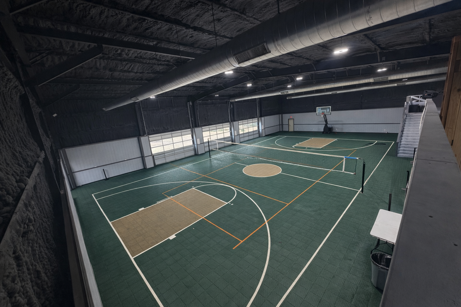 Replace current slippery, unfinished concrete with proper flooring and court lines for basketball, volleyball, and pickleball. Floor the upstairs area (currently painted plywood) and add a shower (and possibly another bathroom) upstairs for visitors.