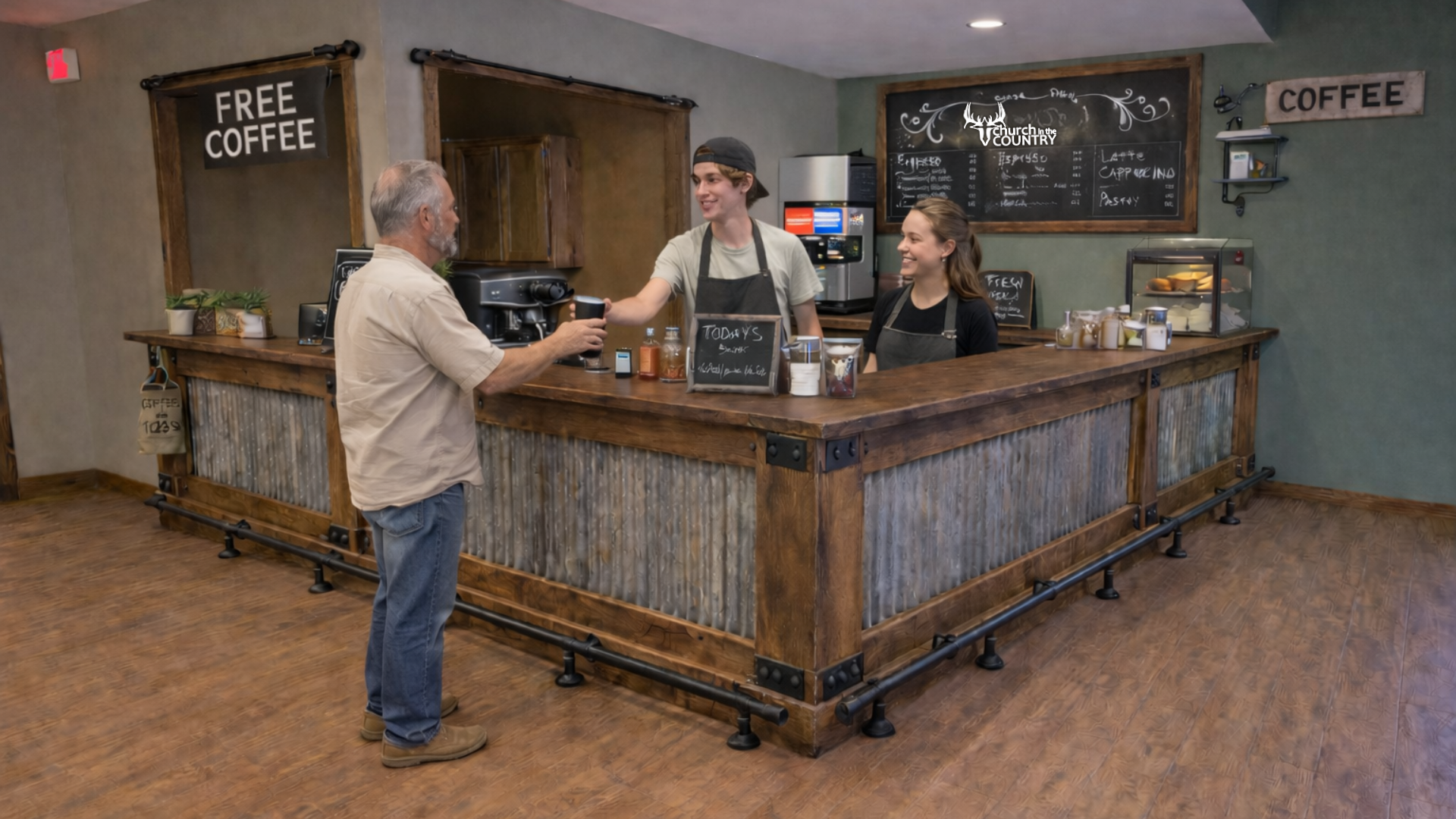Expand current coffee shop, offer specialty coffees for sale (while still providing free coffee), add concessions capability for special events, and include a fountain machine.