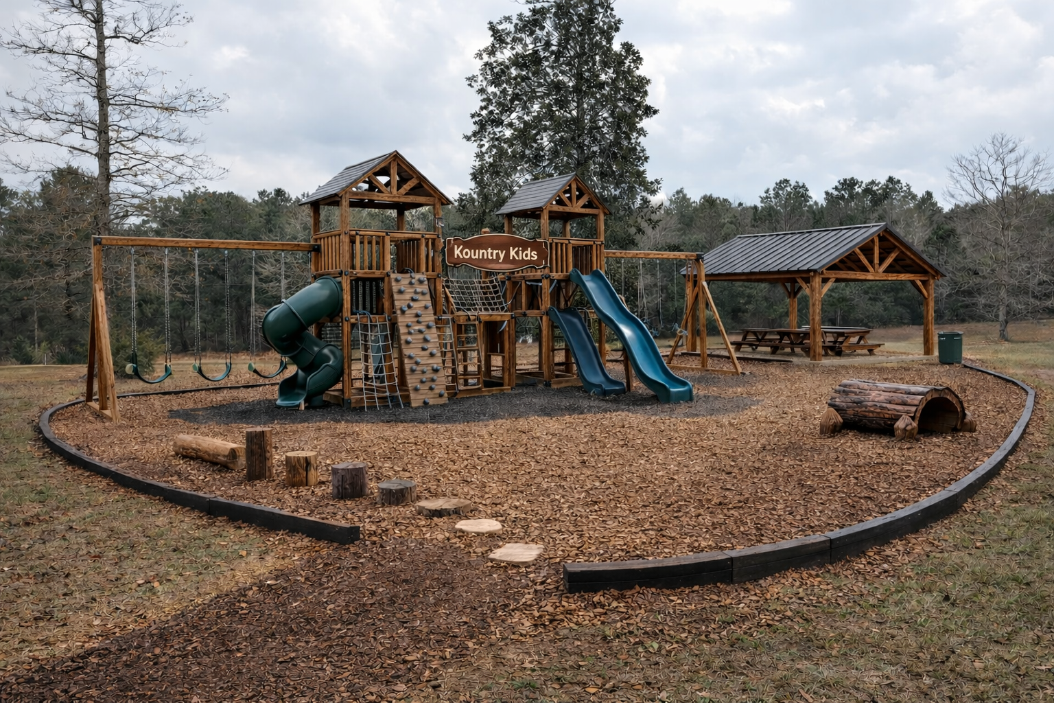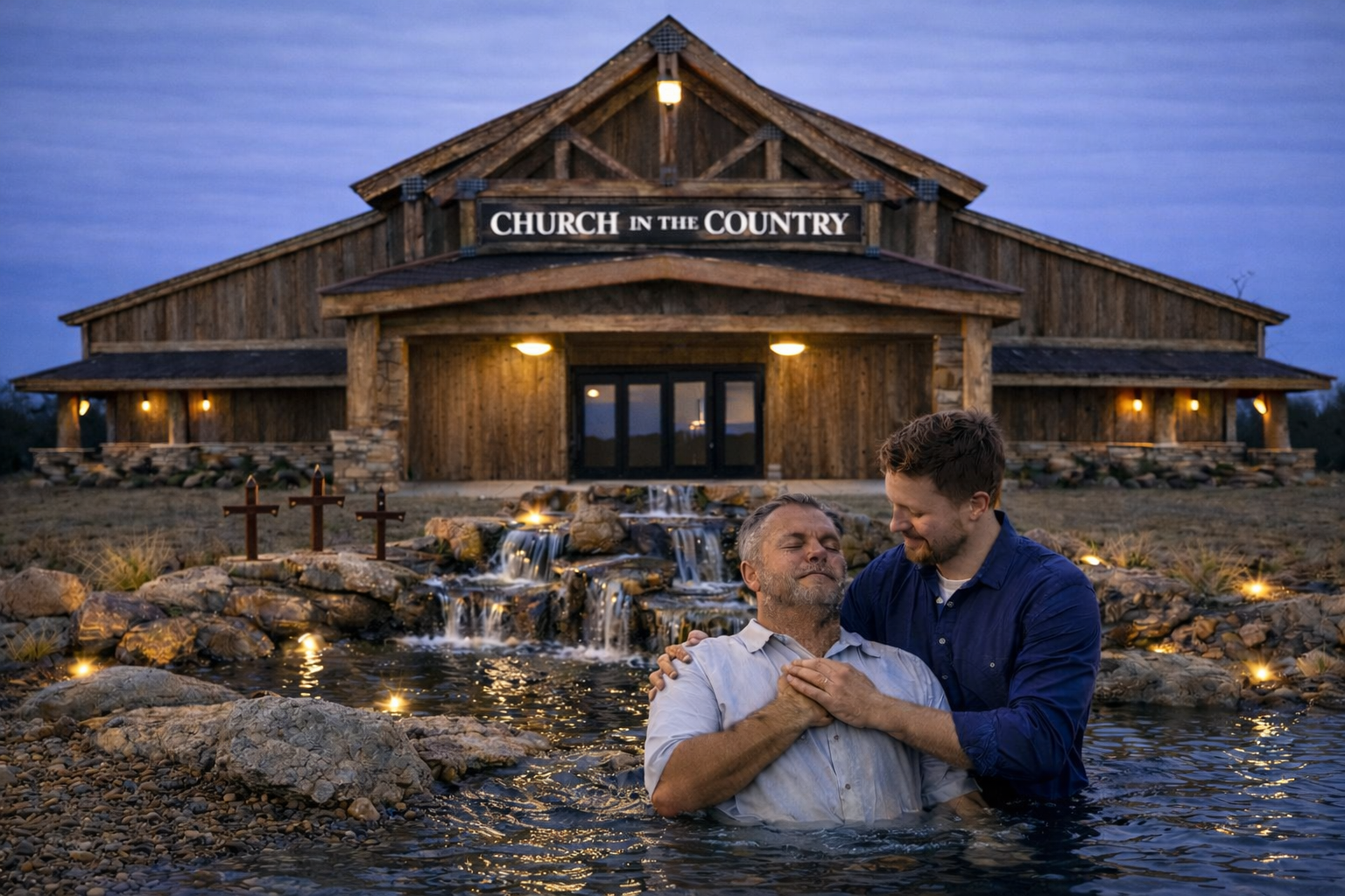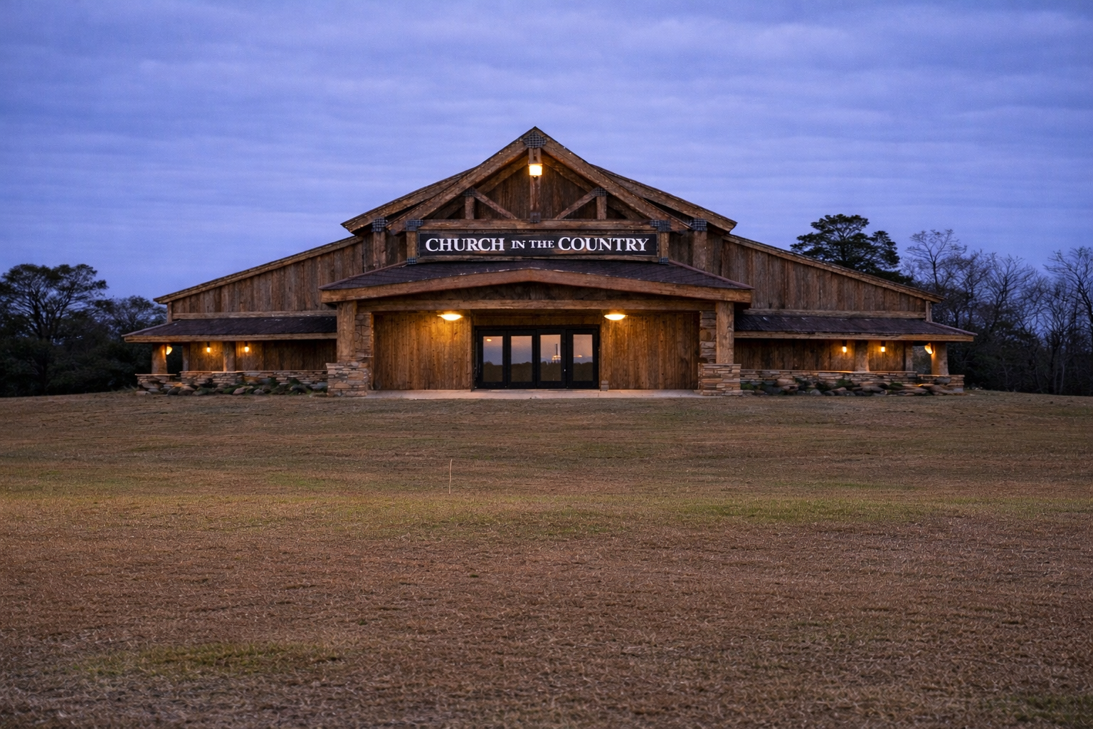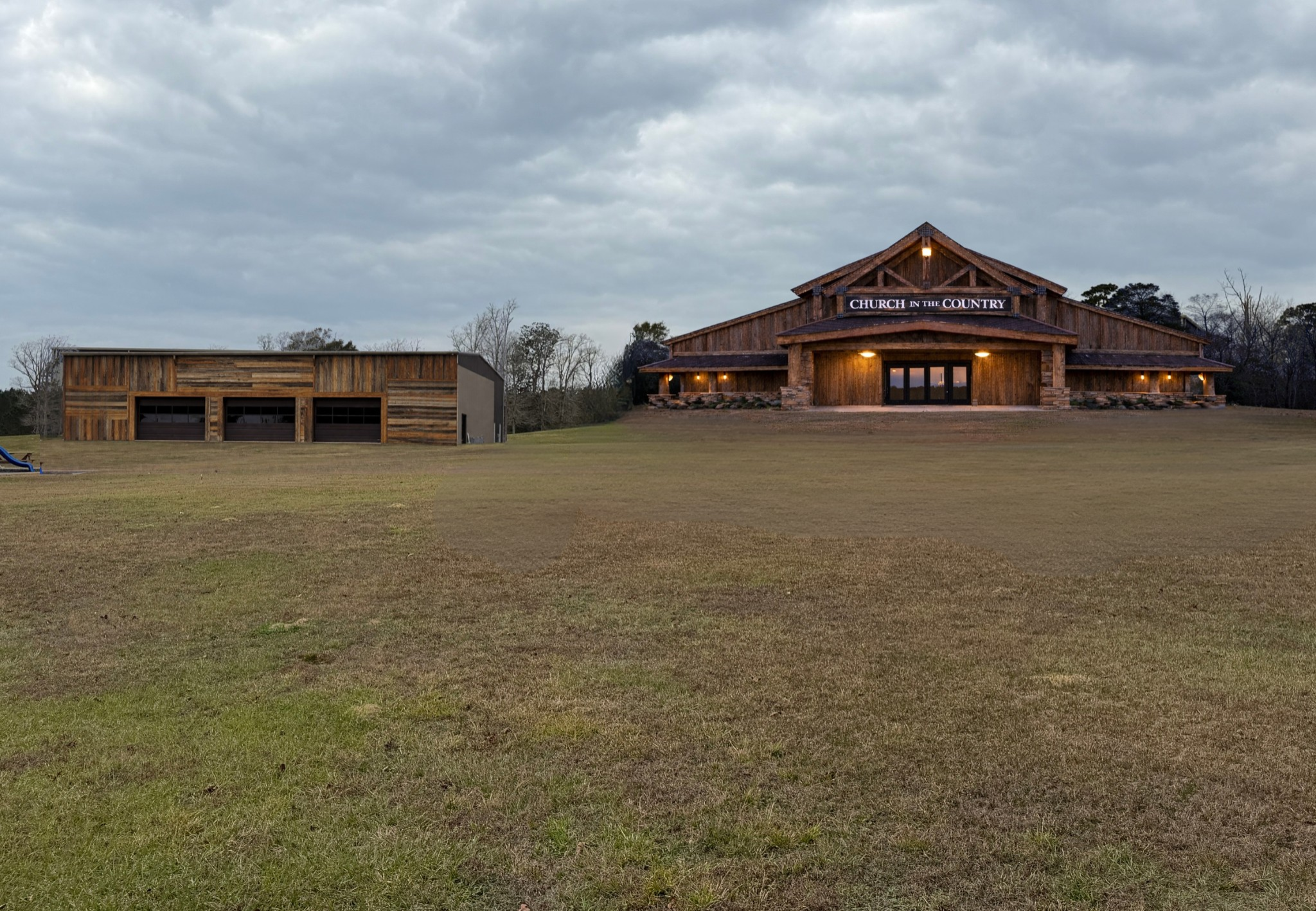 Add wood elements for a Bass Pro Shops–style look, relocate all four glass doors to the center (remove other windows), and add a country water feature with large rocks, landscaping, and an outdoor baptistry area.