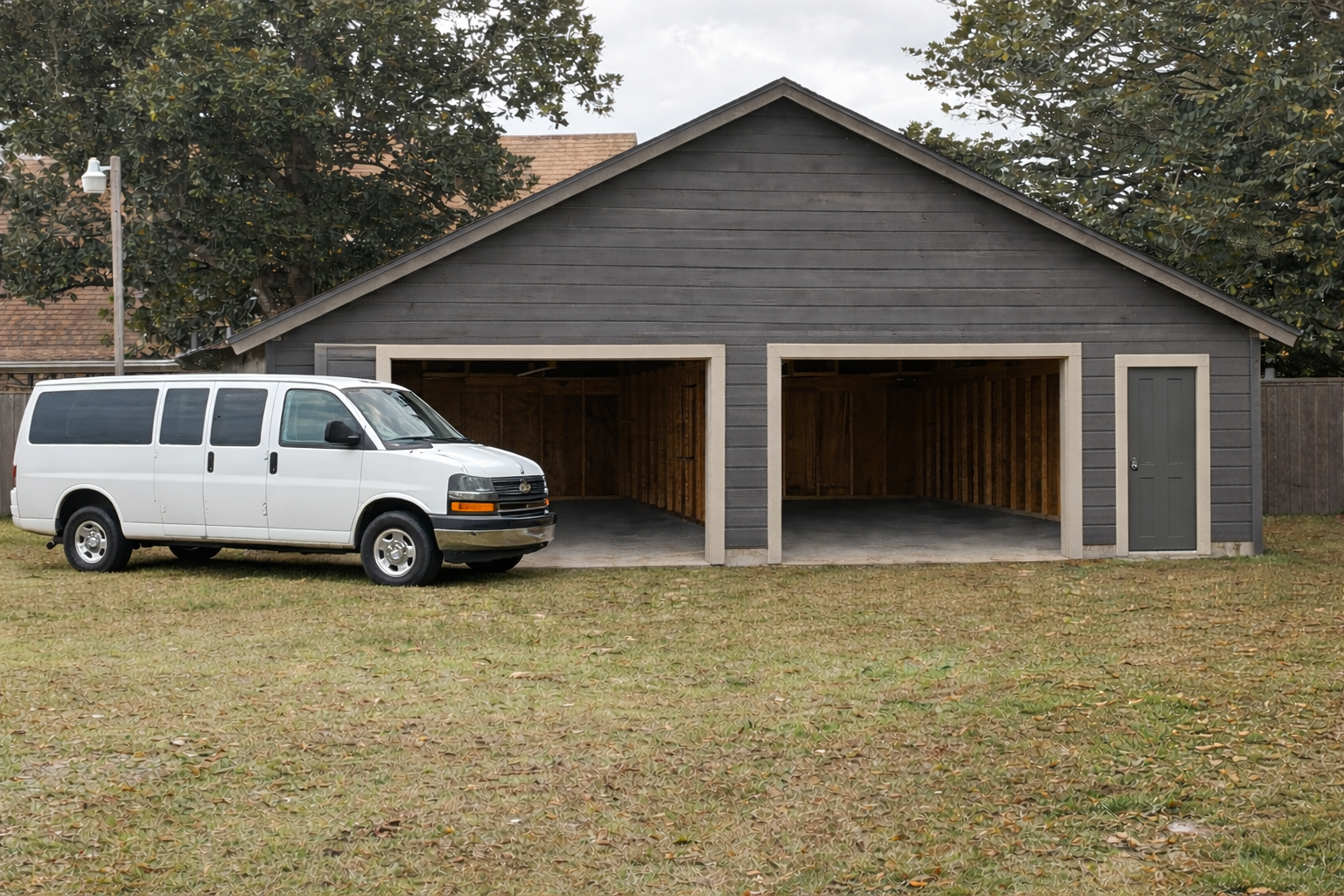 Convert the existing old office into a garage for 2 vans plus additional storage space.